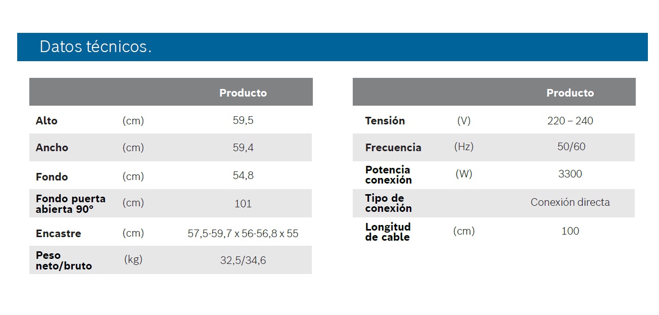 • Tipo de construcción: integrable. • 5 modos de calor. • Capacidad: 66 lts. • Tipo de control: mecánico. • Luz interior. • Pared trasera autolimpiante. • Grill. • Timer mecánico con alarma. • Precalentamiento rápido. • Mandos giratorios. • Luz interior. • Rango de temperaturas: 50-275 °C.